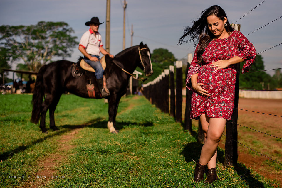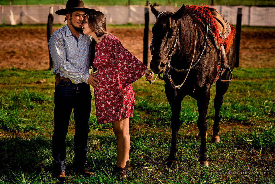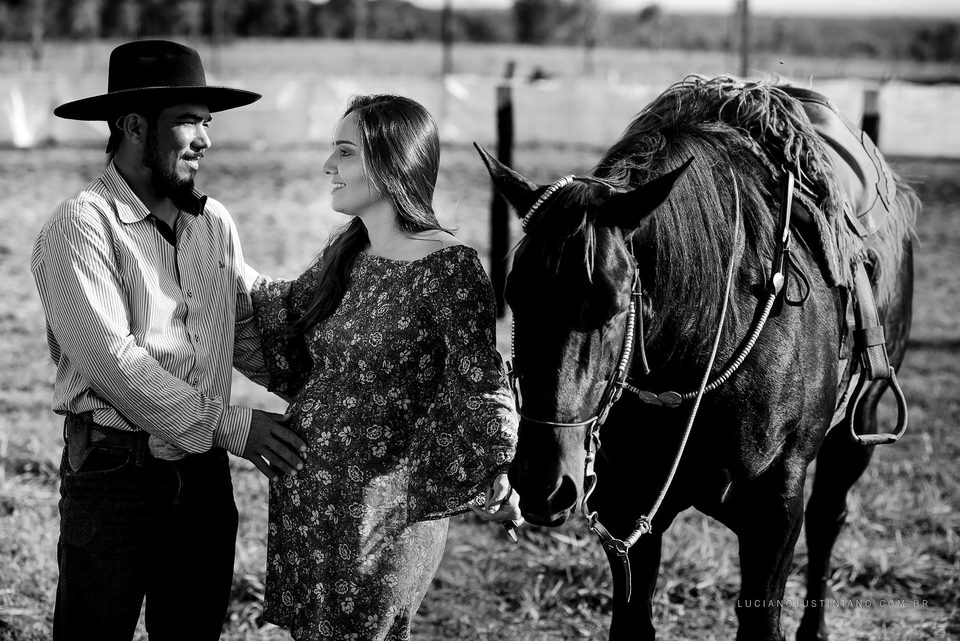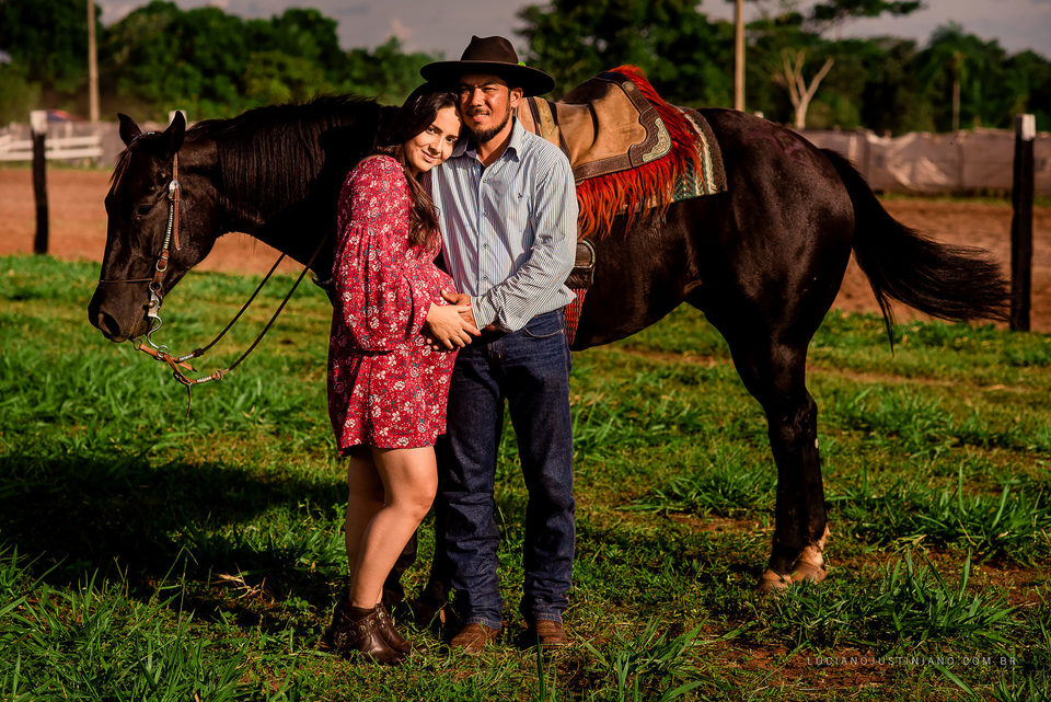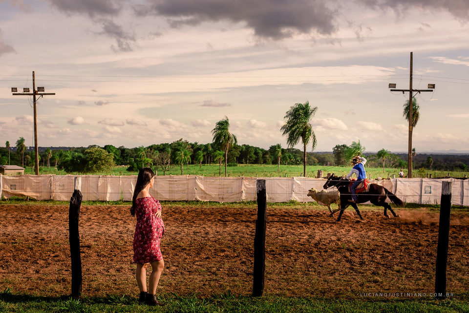 Ligia foi fotografada na pista de laço e na baía da fazenda onde seus pais moram. Não tínhamos muito tempo para fotografar com o seu esposo, pois ele e o avô faziam parte da organização do evento de laçada, então esperamos um tempinho e o fomos rapidamente para não atrapalhar e conseguimos fazer as fotos.