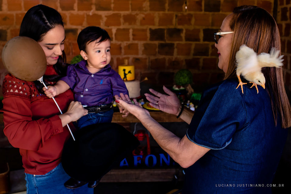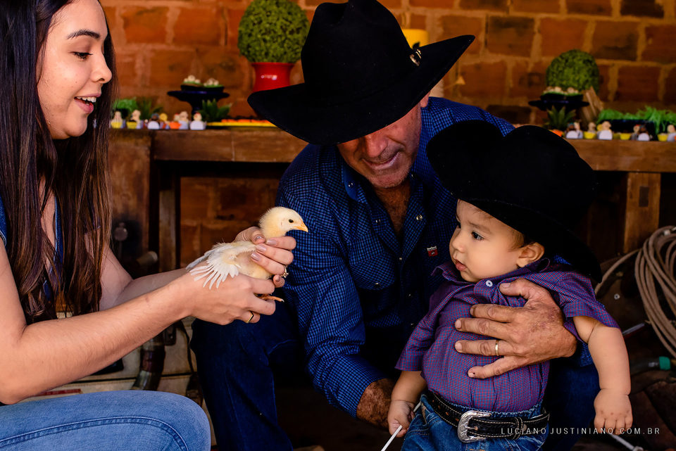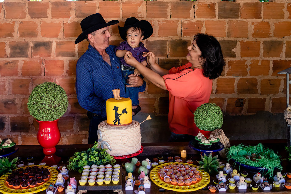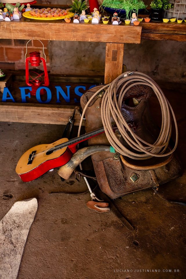 A festa foi feita no galpão da fazenda onde se guarda a traia de arreio, o tema da decoração foi fazenda e teve também, berrante, traia de arreio, laço tudo que a família usa no dia a dia e também como esporte do laço comprido, varal de fotos de familia. Tudo que gosto de fotografar, família, fazenda, amor, lembranças e claro o aniversariante José Afonso que estava todo posando e sorridente para as fotos.