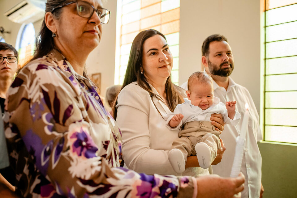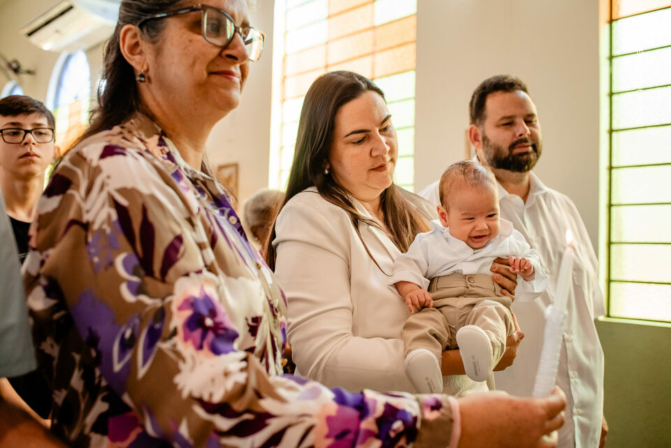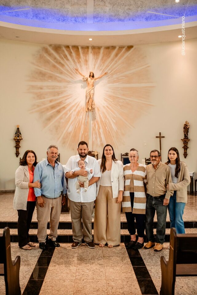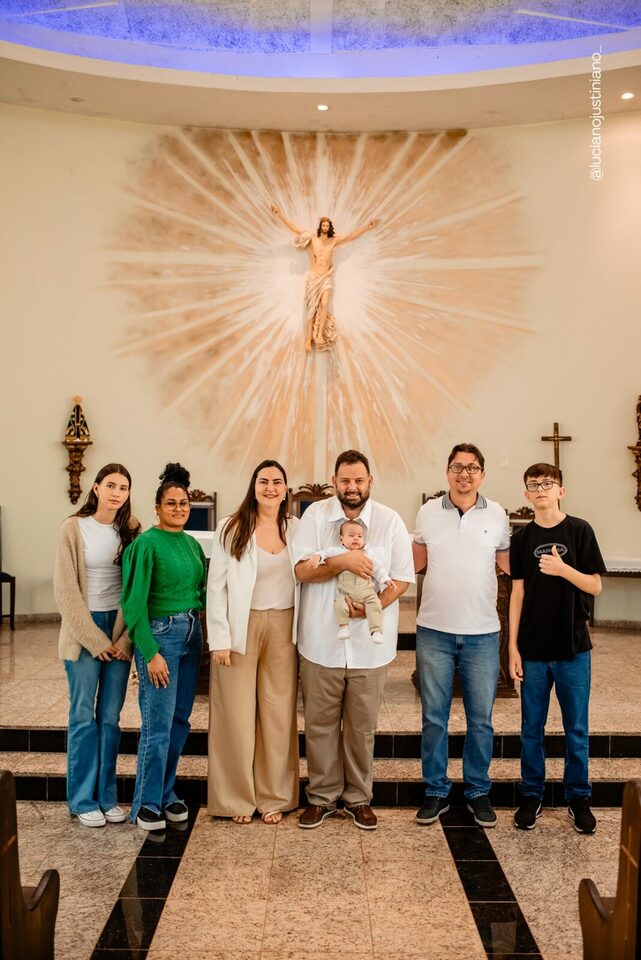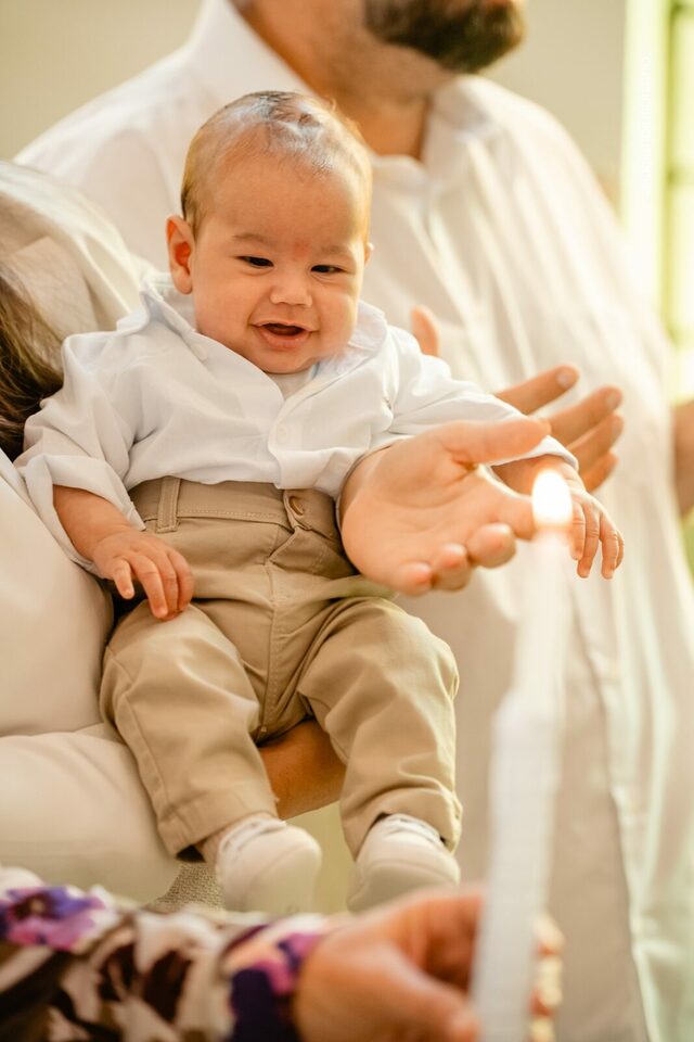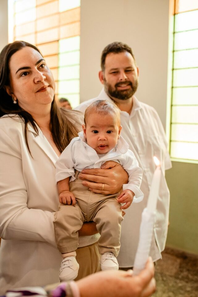 Ver o Matheus sorrindo ao olhar a vela do batismo foi especial. Um sorriso cheio de luz, que carrega toda a história de esperança e oração vivida pela Carmem e pelo Fábio. A chegada do Matheus foi um verdadeiro milagre — resultado da união, da fé inabalável e do carinho de toda a família Braga Florença.